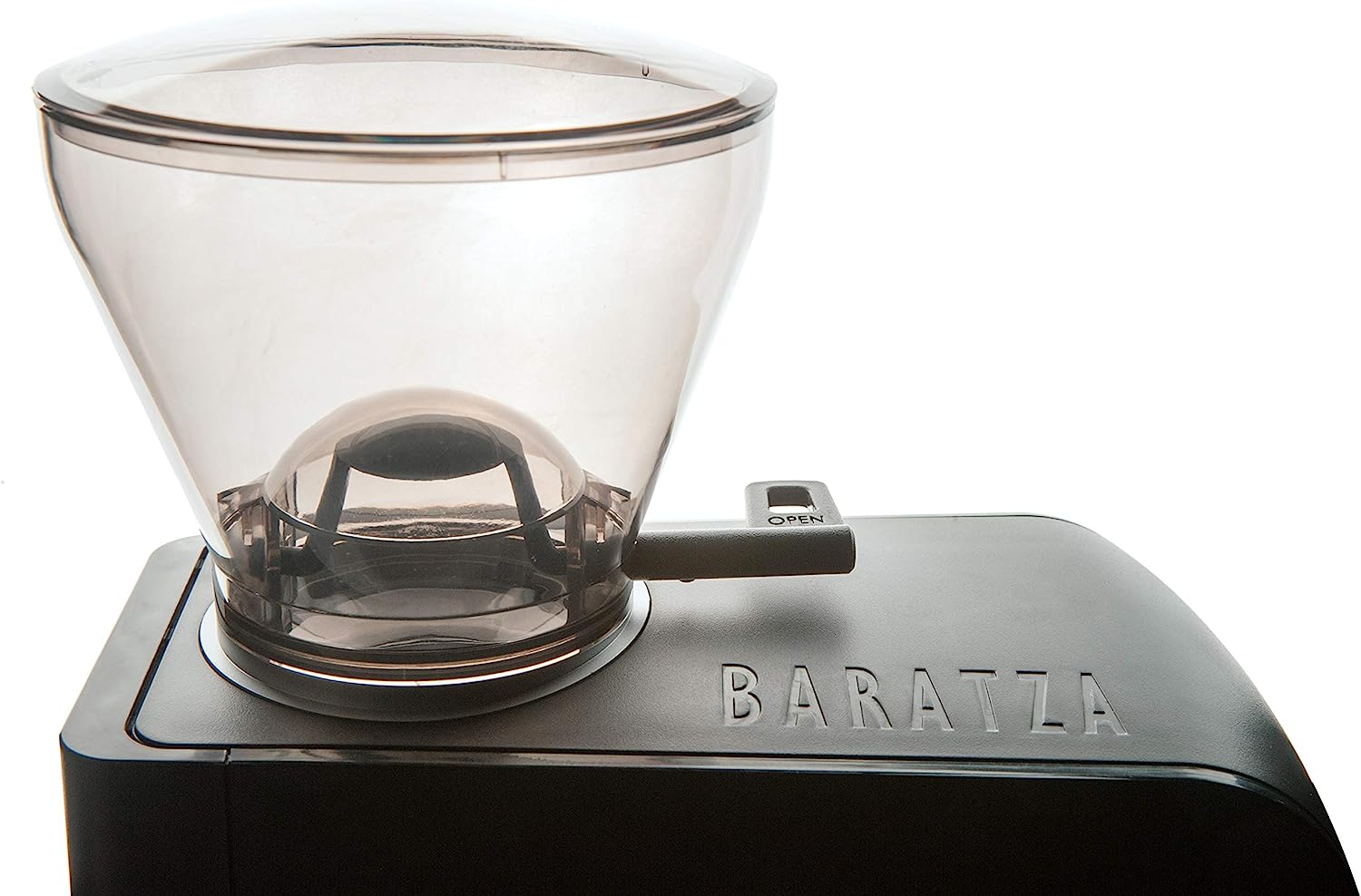 The hopper holds approximately 300-400g of coffee. An innovative bean shutoff feature in the collar permits no-mess, no-fuss hopper removal for changing out beans.